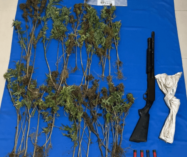 Durante las acciones, las autoridades incautaron 56 plantas que se presume son de marihuana, junto con armas y otros elementos que refuerzan la sospecha de una operación bien estructurada de tráfico ilícito de drogas.